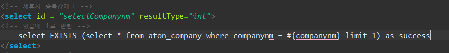 resultType을 int로 해서 companynm(중복값을 검증할 컬럼)값이 있다면 1로 반환을 해주고, 없으면 0을 반환해준다. 이걸 가공해서 뿌리면 됨~!