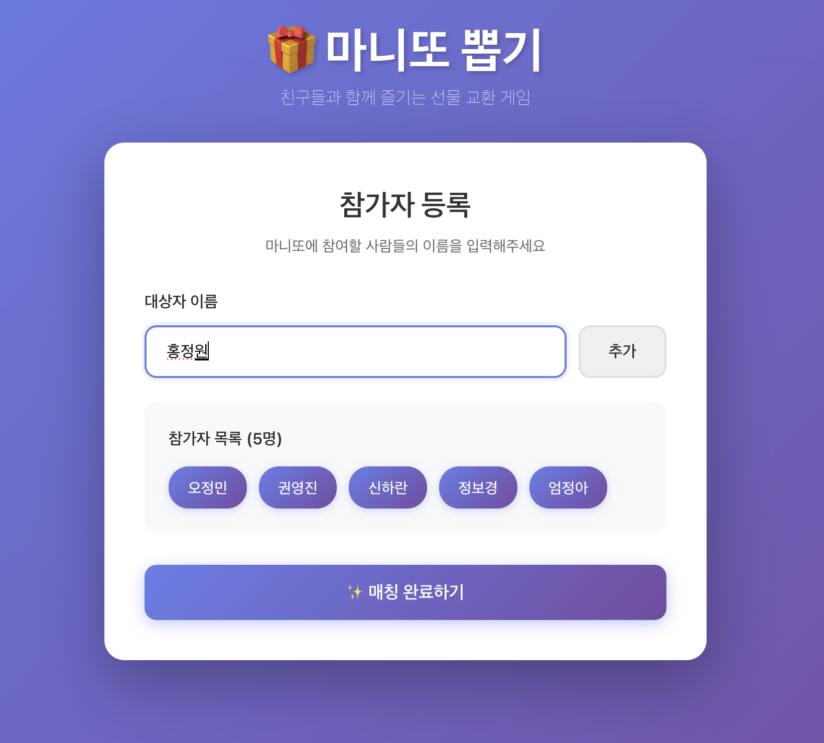 먼저 참가자 등록 화면이다. 마니또를 참여 할 참가자 리스트를 등록한다.