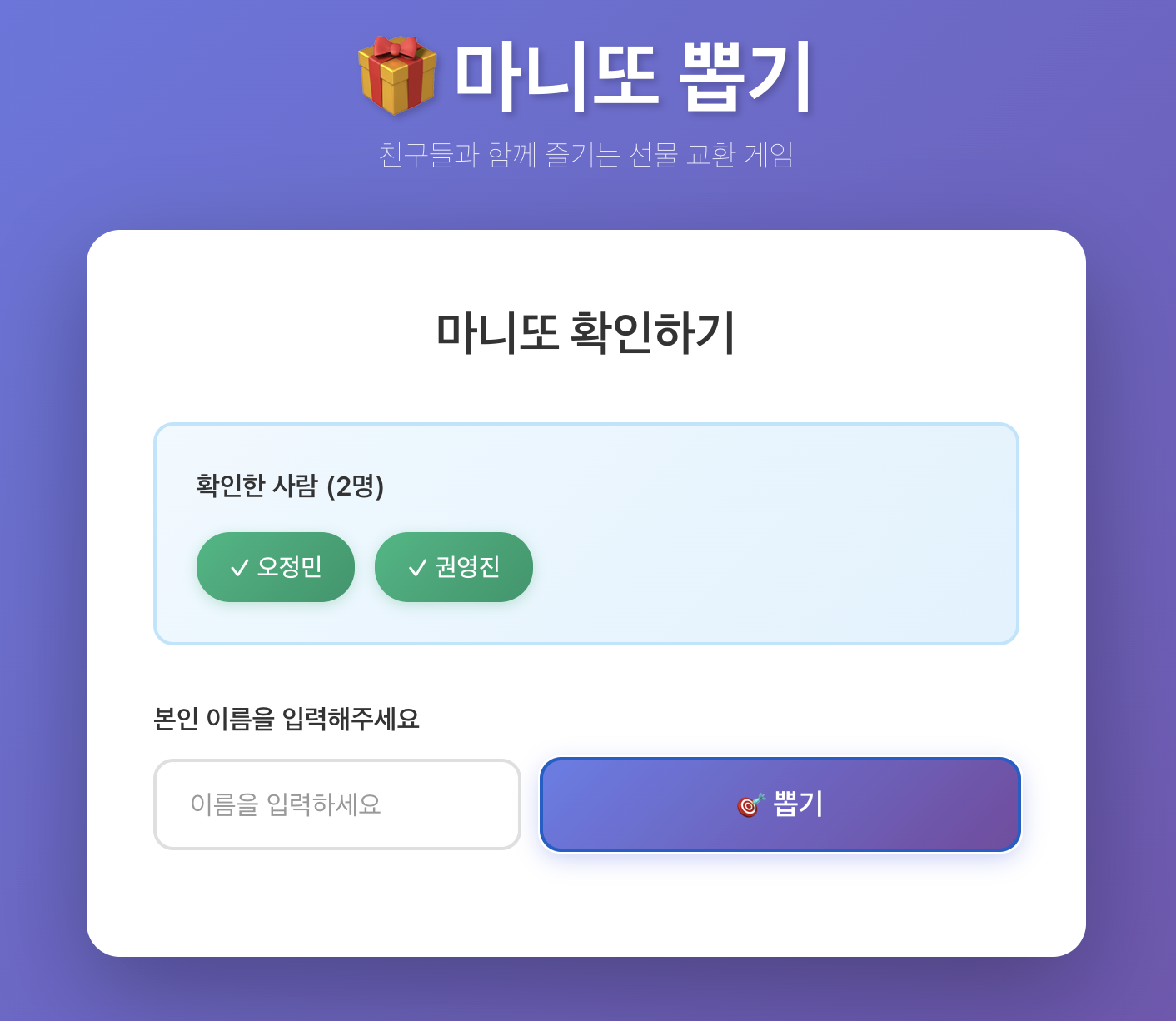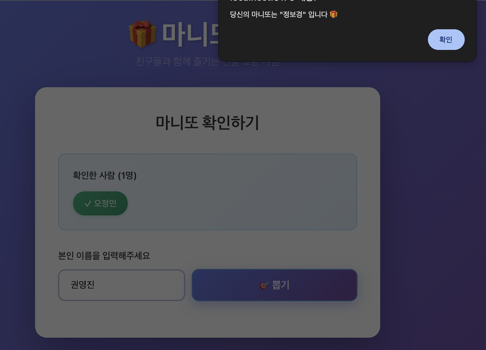 본인의 이름을 적고 뽑기 버튼을 클릭하면, 본인에게 매칭된 상대를 alert으로 알려준다.